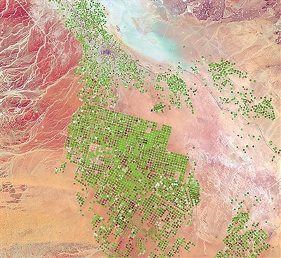 人工智能系统AlphaEarth将卫星图像(例如这张灌溉农田图像)与其他类型的地图整合,从而呈现出数据丰富的地球图景。