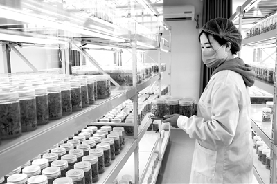科技特派员在甘肃省民勤县人参果脱毒育苗中心查看育苗情况。本报记者 颉满斌摄