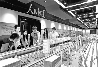 图为学校师生观看交通运输沙盘仿真模型。本报记者 洪星摄