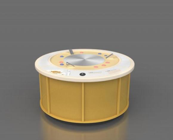 展项由转盘、圆环及圆盘等组成 ,展项中的圆盘在转动的转盘 中 ,受各种复合作用力的影响 ,包括 :重力、摩擦力、离心力等 ,展 现出不同的运动状态。有的会重心不稳 ,倒在转盘上被甩出去 ;有的 会在转盘上滚动 ,并沿着弧线滚出去 ;有的会在转盘上做相对静止的 旋转。观众按下“启动”按钮 ,转盘转动 ,将圆环、 圆盘或圆球沿倾 斜轨道放入到转盘中 ,可观看复合力对物体运动状态的影响。
