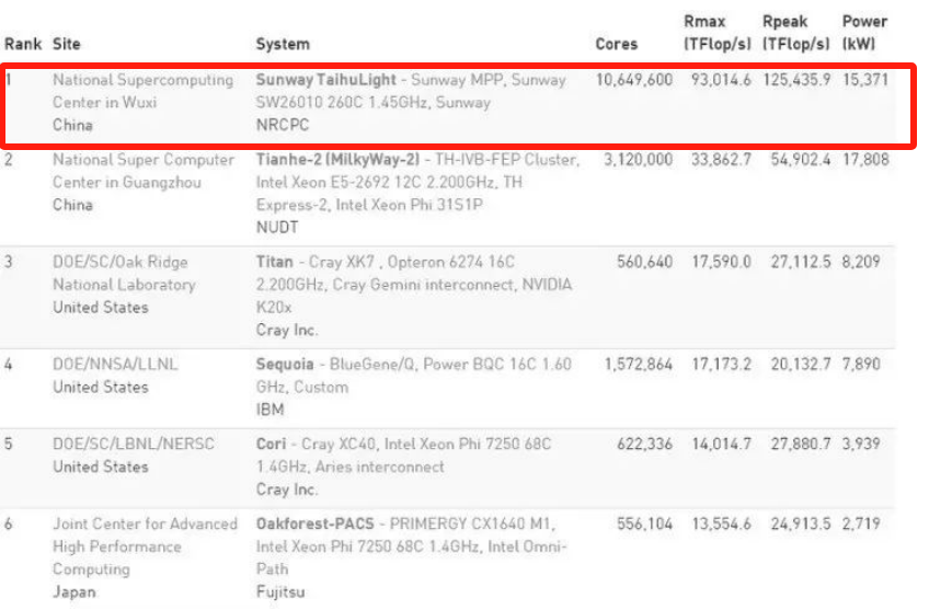 那么,超级计算机到底能有多快?神威·太湖之光交出的答案是——Linpack实测性能为每秒93千万亿次浮点运算,即93PFLOPSPetaFLOPS)。Linpack是超级计算机领域十分权威的性能基准测试工具,用于测量系统的浮点计算能力。并且,神威·太湖之光的理论峰值性能为125PFLOPS,凭借于此,它于2016年登顶全球超级计算机榜首,是当时世界上第一台突破100PFLOPS理论峰值的超级计算机。