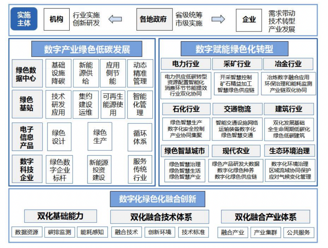中国高度重视数字化绿色化协同转型发展工作,出台《数字中国建设整体布局规划》《中共中央国务院关于加快经济社会发展全面绿色转型的意见》等政策文件,加速数字化绿色化协同发展,推进能源资源、产业结构、消费结构转型升级,推动经济社会绿色发展。2024年8月,国家网信办等十部门秘书局(办公厅、综合司)联合印发《数字化绿色化协同转型发展实施指南》,明确了双化协同三类实施主体、两大发力方向,以及双化协同基础能力、融合技术体系、融合产业体系等双化协同融合创新三方面布局。