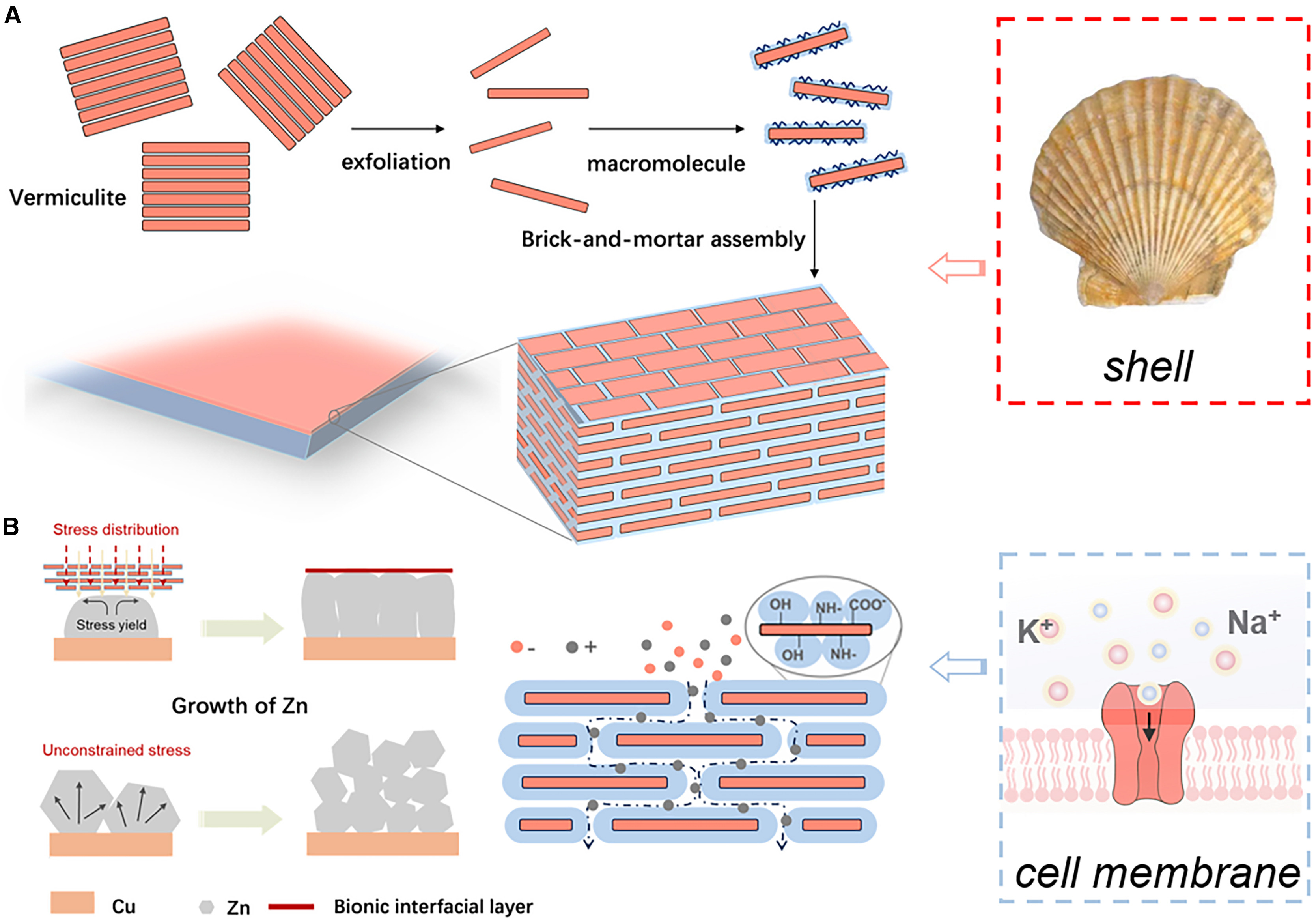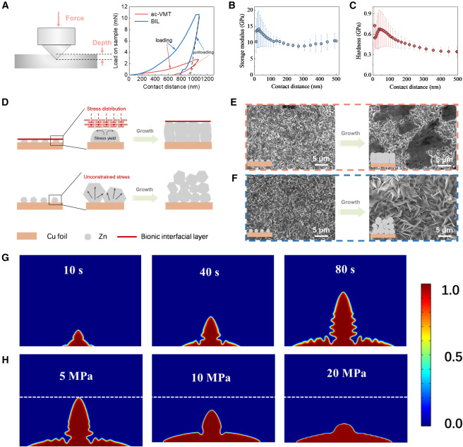 该成果受贝壳微观结构的启发,利用从天然蛭石和生物材料中提取的廉价、安全和绿色的原材料,在锌金属负极上构建了结构相似的仿生人工固体电解质界面层(Solid Electrolyte Interphase, SEI)。仿生人工SEI具有9.8 GPa的超高储能模量和超过0.5 GPa的平均硬度,在沉积过程中使锌枝晶在应力下屈服,有效地抑制了枝晶生长。此外,二维片状材料堆叠并且与生物聚合物相结合,形成选择性离子通道,可实现锌离子的高效快速传输。研究结果加深了锌负极溶解/沉积过程的力-电化学耦合认知,同时为金属负极的SEI结构设计提供了新的研究思路。