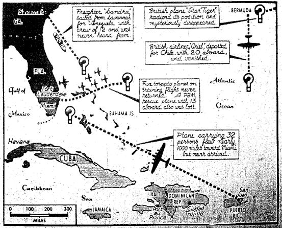 又如两次英国南美航空的客机失踪事件。1948年,“星虎号”(Star Tiger)客机在从亚速尔群岛飞往百慕大的途中失联;1949年,“星狮号”(Star Ariel)客机在从百慕大飞往牙买加途中失踪,媒体称其“离奇蒸发”。