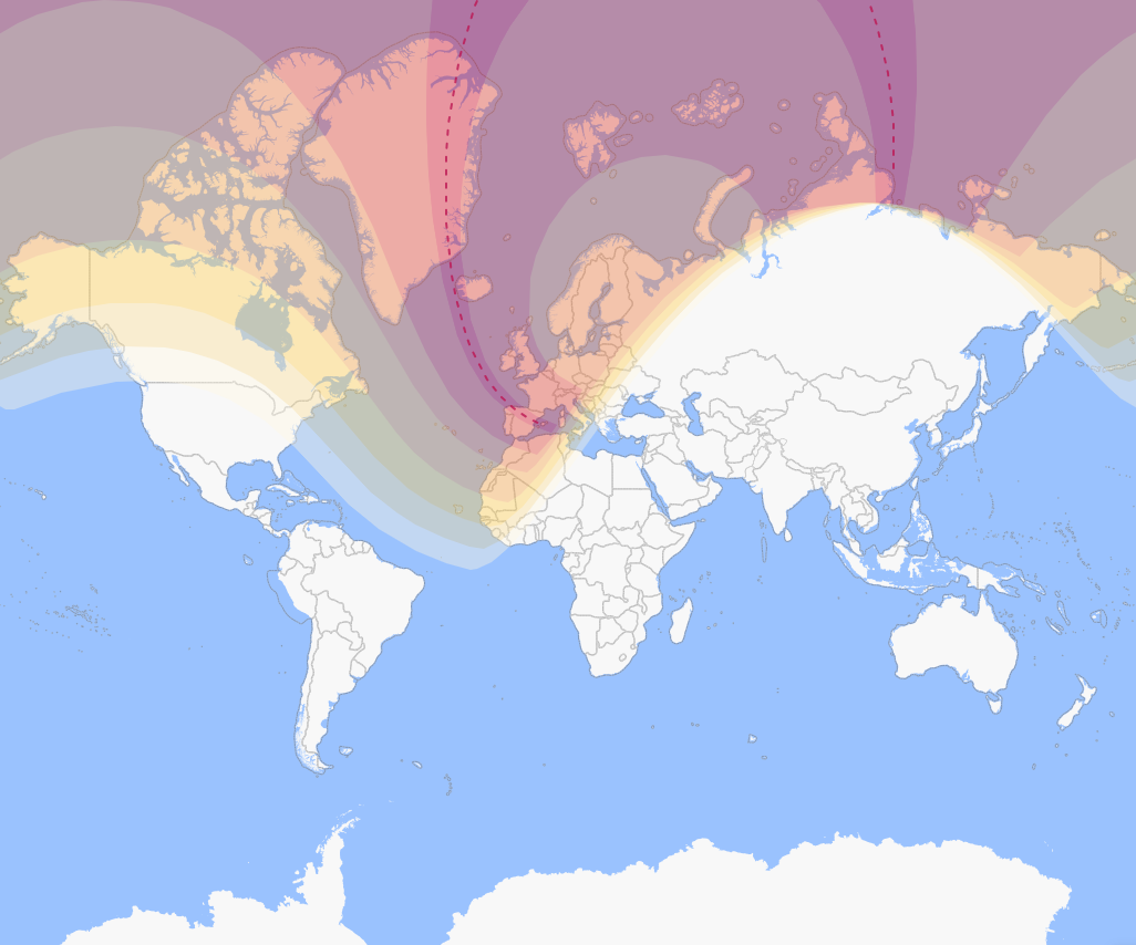可见范围:南美洲、北美洲东部、格陵兰岛及南极洲局部