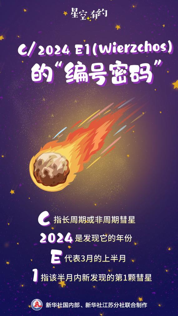C/2024 E1 (Wierzchos)的编号中还蕴藏着这颗彗星的“发现密码”。其中,C指长周期或非周期彗星,2024是发现它的年份,E代表3月的上半月,1则指该半月内新发现的第1颗彗星。“它的轨道接近抛物线,它将于2月17日达到最接近地球的位置,之后将‘飘然而去’。”王科超说。