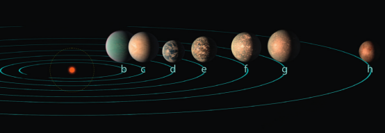 TRAPIST-1是一颗非常瘦小的红矮星,位于宝瓶座方向,它的质量只有太阳的9%,稍稍超出恒星质量下限,它的直径仅仅比木星稍大,表面温度2280℃,距离我们约39光年。位于智利的行星和小行星凌星小型望远镜(TRAPPIST)于2016和2017年在这颗暗弱的恒星周围共发现了7颗系外行星——TRAPPIST-1b、c、d、e、f、g、h。这7颗行星的大小都和地球相仿,不过它们都位于非常接近恒星的轨道上,公转周期最长也只有20天左右。其中TRAPPIST-1d、e、f、g这4颗行星都位于该恒星的宜居带上,这是已知同一宜居带内拥有行星数量最多的恒星系统。图为TRAPIST-1系统示意图。