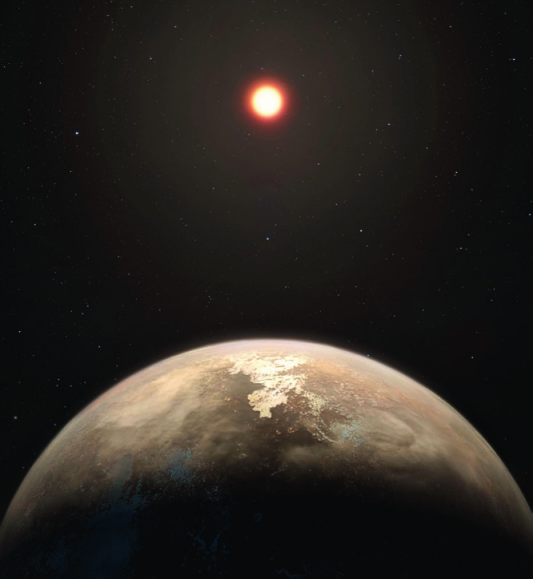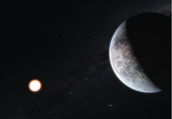 罗斯128位于室女座方向,距离我们约11光年,这是一颗非常年轻的红矮星,年龄只有9.5亿年,它的质量和半径分别是太阳的1/6和1/5,光度只有太阳的1/300。2017年,欧南台利用径向速度法发现了它的系外行星罗斯128b,从发现之初,它便被认为是一颗宜居行星的候选者之一。罗斯128b的质量约是地球的1.35倍,表面极有可能是固态的,其公转轨道半径约是日地距离的1/20,表面温度约7℃。不过罗斯128作为一颗较为年轻的恒星,可能会产生致命的耀斑,使得罗斯128b的大气层消失。图为罗斯128b的艺术想象图。