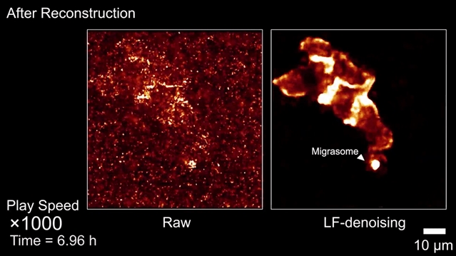 由于观测时激发光强仅设置为10 μW/mm2,原始成像数据信噪比极低,难以清晰地观测斑马鱼胚胎膜结构。增强激发光强度则会由于光毒性造成样本快速被漂白,因而无法实现2小时以上观测。LF-denoising成功地在极低激发的条件下,完成了10小时连续成像观测,并从光子噪声与模式噪声的复杂环境中,还原出了斑马鱼胚胎发育过程中产生迁移体的全过程。