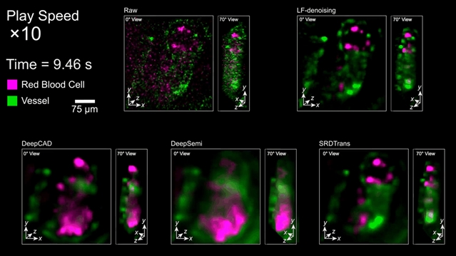 由于心肌组织的快速活动造成的血管变形和血细胞随血液的快速移动,斑马鱼幼鱼心跳具有高度动态的数据特征。先前方法单一依赖时间冗余性或空间冗余性,造成了分辨率和保真度的损失。LF-denoising通过空间角度的高维冗余性,在保持保真度的同时以高分辨率还原了高信噪比血管结构和完整的血细胞动态。