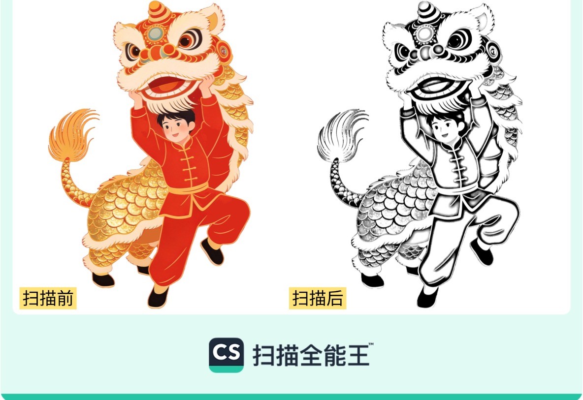 国漫的生命力,不仅来源于专业创作者,更来自大众参与。无论是泛黄的小人书,还是张贴的国风海报,用户只需随手一拍,扫描全能王即可一键生成清晰的黑白线稿,方便用户临摹、填色。