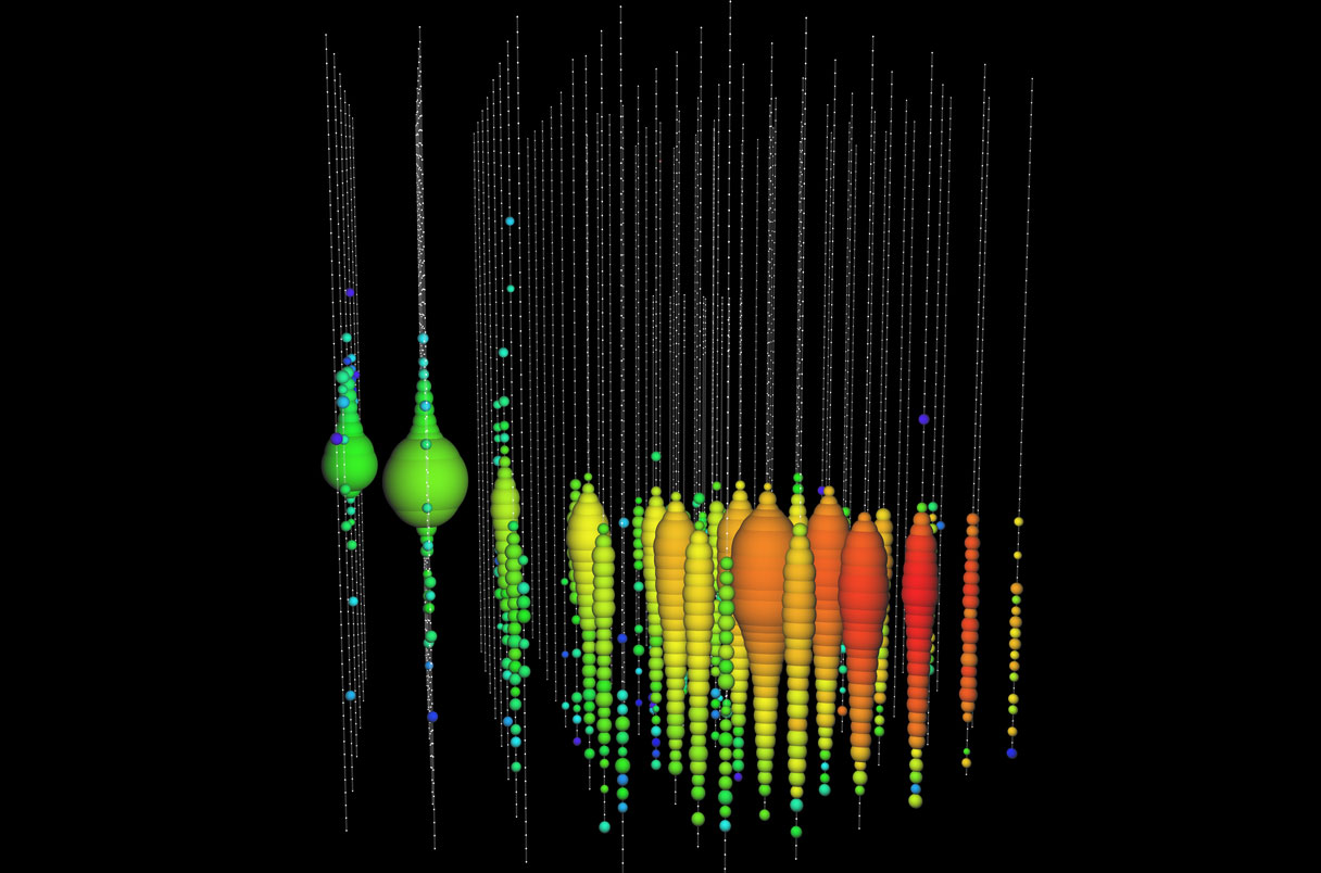 冰立方团队使用了13年的数据,通过两种方式进行分析。首先,他们使用常规方法测量1万次簇射事件和23万条径迹事件。其次,他们运用机器学习在数据中搜寻更罕见的事件,即簇射或径迹始于探测器内部的事件。这种先进工具筛选出了5千次簇射和5千条径迹,并对产生这些径迹的中微子的能量给出更精确的估计。