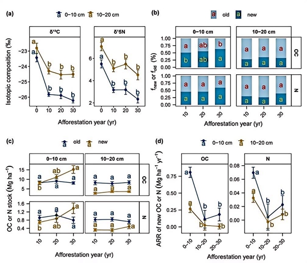 在此阶段,δ13C 和 δ1?N值下降最快,表层土壤(0–10 cm)的大团聚体成为新有机碳和氮积累的“热点区域”,表现出最高的积累速率。随着林龄增长,新输入的有机碳和氮储量持续增加,而原有组分相对稳定。新有机碳和氮的积累速率在造林十年时达到峰值,之后显著下降,表明土壤碳固持能力随造林时间延长逐渐趋于饱和。