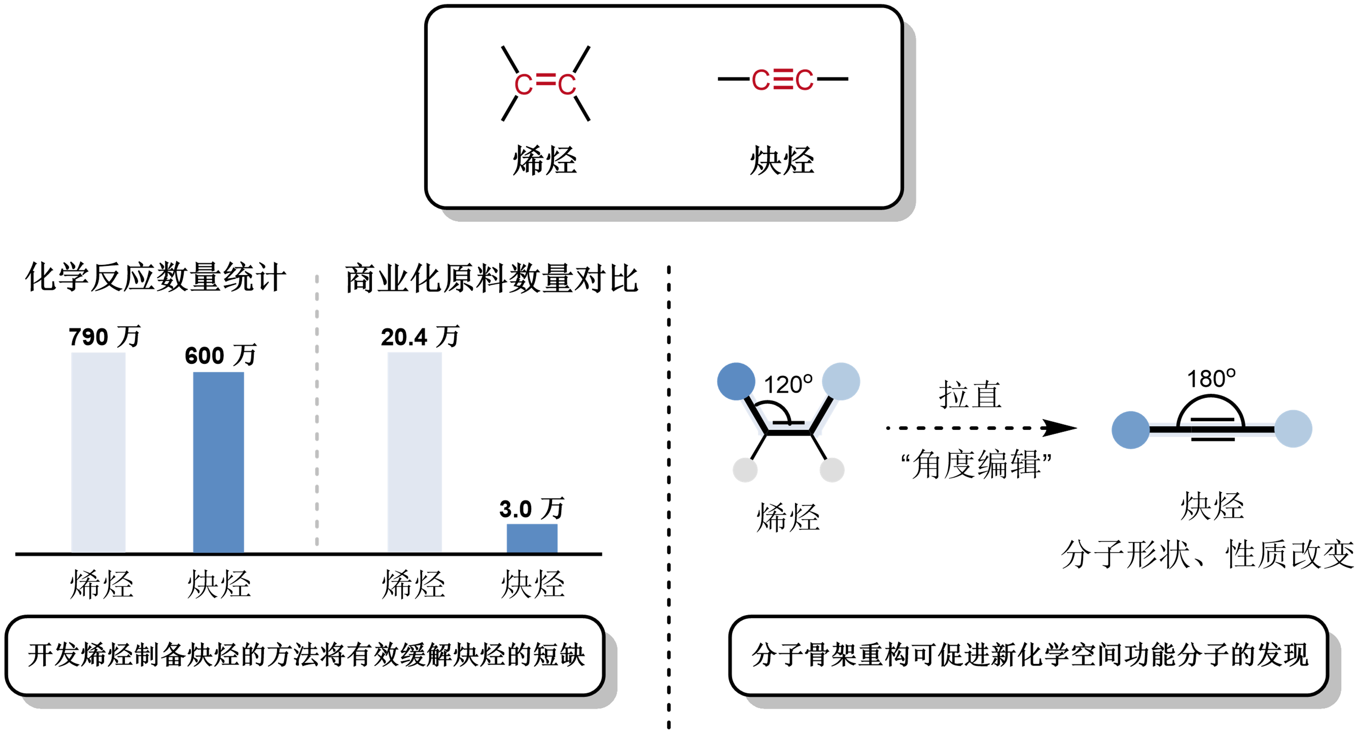 烯烃与炔烃,是现代合成化学的重要基石。从烯烃聚合、硼氢化反应、烯烃复分解到点击化学,相关突破多次获得诺贝尔化学奖,足见其科学与应用价值。然而,与烯烃来源丰富形成的供需平衡相比,炔烃的供给远不抵需求——种类有限、价格高昂,严重制约了其应用。此外,将折线形的烯烃“拉直”为直线型炔烃,这一局部“角度编辑”可重塑分子整体构型与性质,为新药研发开辟新径。因此,如何将廉价烯烃高效转化为炔烃成为科学界持续关注的焦点。