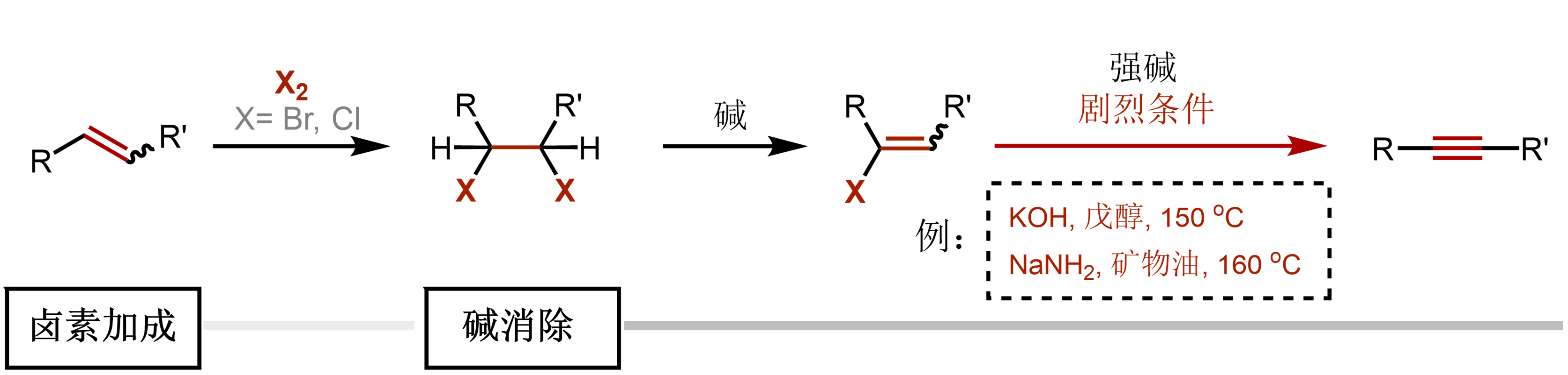 这一探索始于1861年,著名的马氏规则的提出者马尔科夫尼科夫首次报道由烯烃合成炔烃,但方法需高温强碱,官能团兼容性差(图2)。遗憾的是,此后160余年,始终未出现温和实用的替代方案。