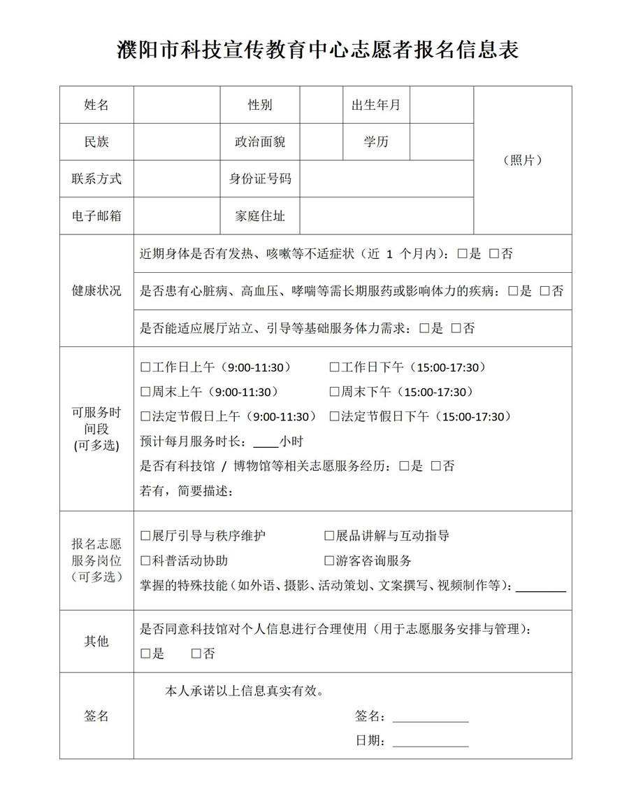 濮阳市科技宣传教育中心志愿者报名信息表